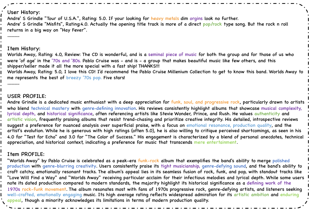 A key challenge, however, is that the optimal profile format is unknown, and handcrafted templates often misalign with task objectives. We propose DUET, a framework for joint exploration of user–item profile generation in text. The framework operates in three stages: First, raw histories and metadata are distilled into simple cues that capture minimal but informative signals. Second, during a single sequence-to-sequence inference pass, these cues are expanded into richer prompts and then into textual profiles, allowing for the exploration of multiple formats rather than a single creation.