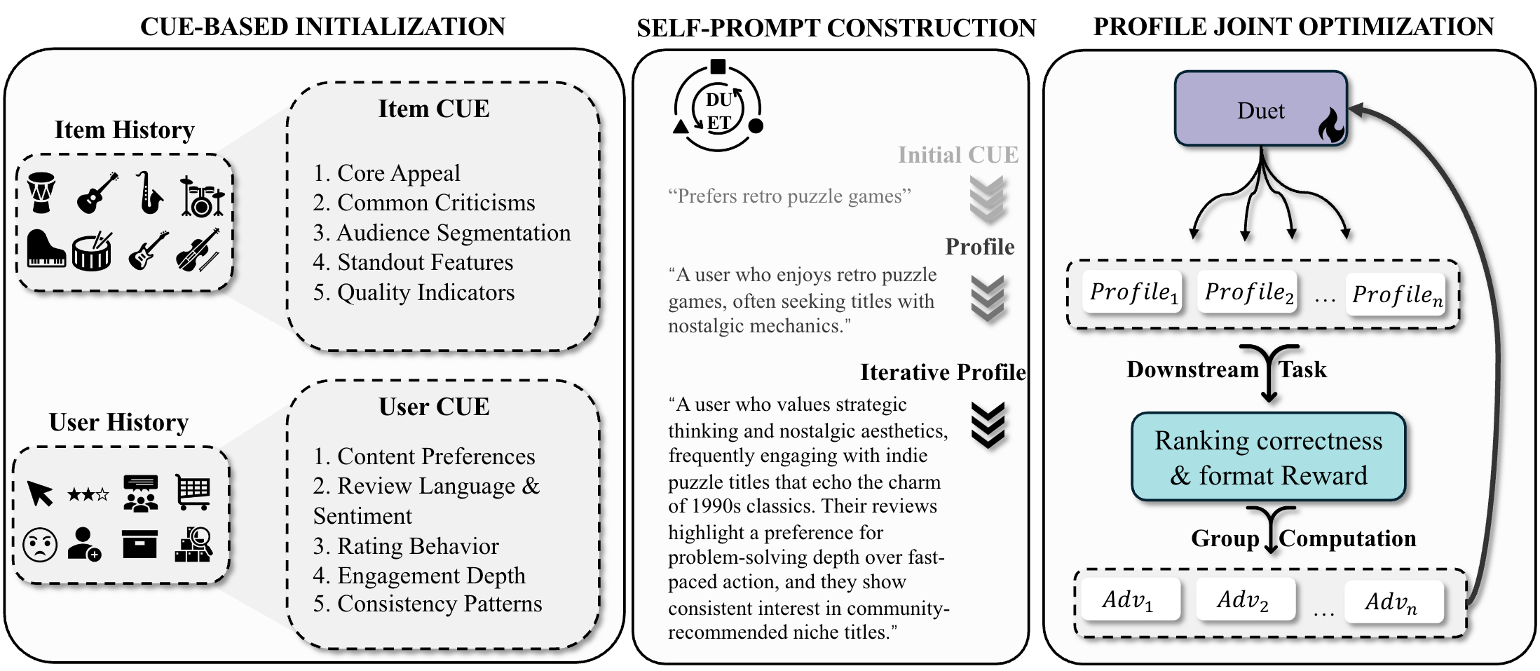 Finally, profiles are optimized jointly via reinforcement learning, where downstream recommendation performance provides feedback to refine and align them. Experiments on three real-world datasets demonstrate that DUET outperforms strong baselines, validating the effectiveness of joint textual profile alignment and the utility of prompt-driven exploration.