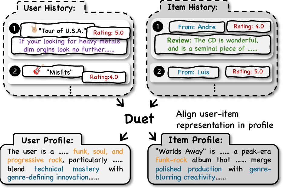 DUET aligns raw user and item data by transforming them into textual profiles within a shared semantic space. Traditional recommendation systems use hidden vectors, but we advocate a shift from vectors to text: representing users and items as textual profiles that are directly compatible with LLMs and offer interpretability for downstream agentic systems.